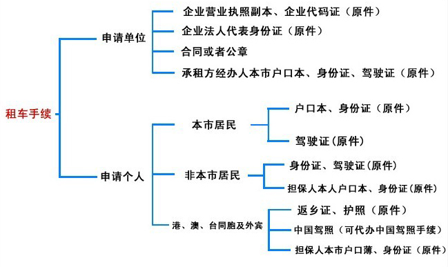 1 、单位租车须交验营业执照副本、法定代表人授权委托书、法定代表人身份证、企业代码、单位公章、单位证明及经办人身份证、户口本、用车人的驾驶证、一寸红底免冠照片二张(必须由我公司委派司机亲临贵公司办理)。